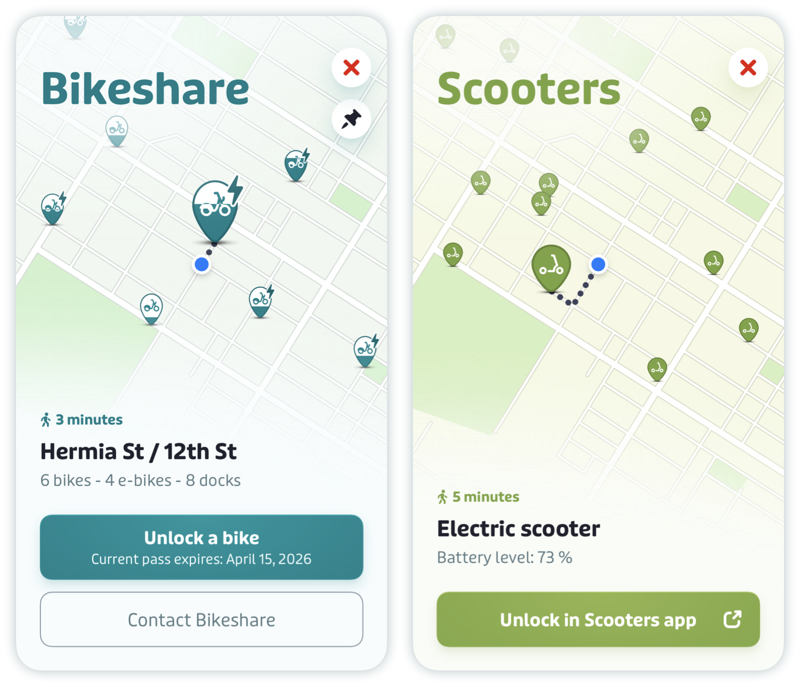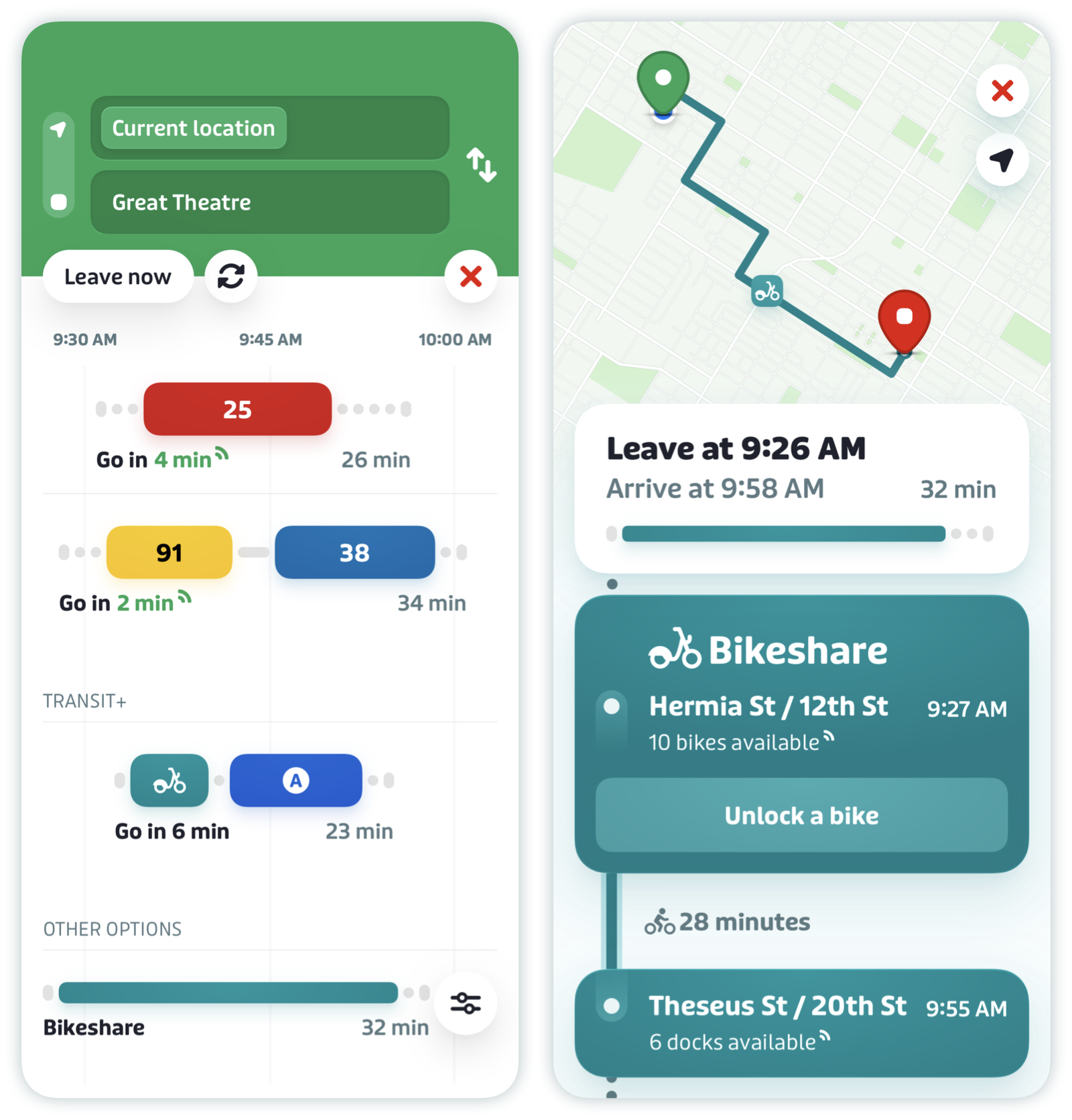 In some cities, you can purchase bikeshare passes and unlock bikes directly in the app, while in most locations, Transit will redirect you to the native app of the service you are using.