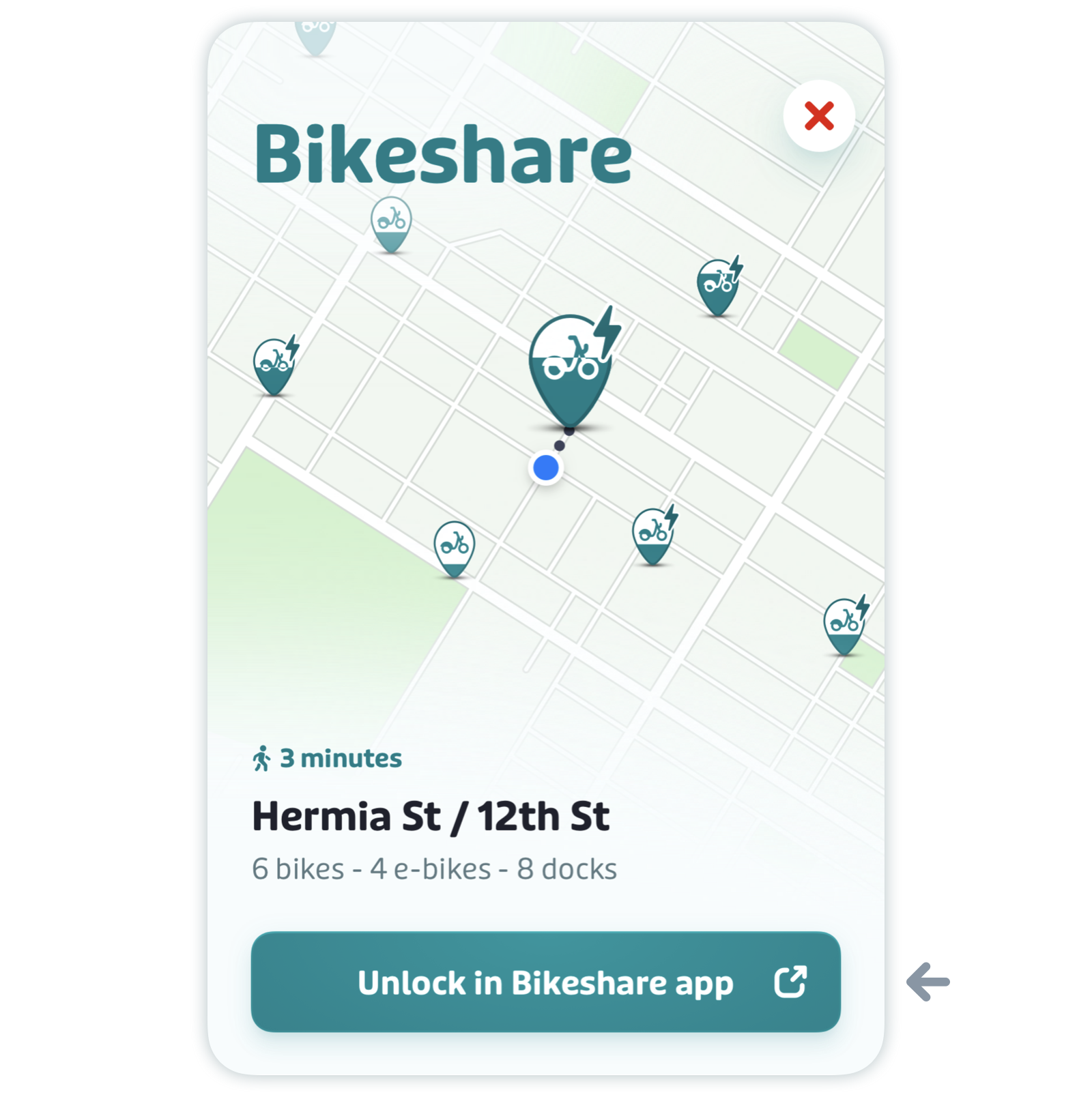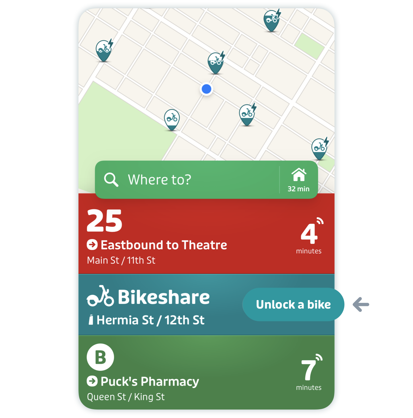 Select the bikeshare station you want to use on the map, or find the bikeshare card in the list of nearby routes and tap "Unlock a bike".