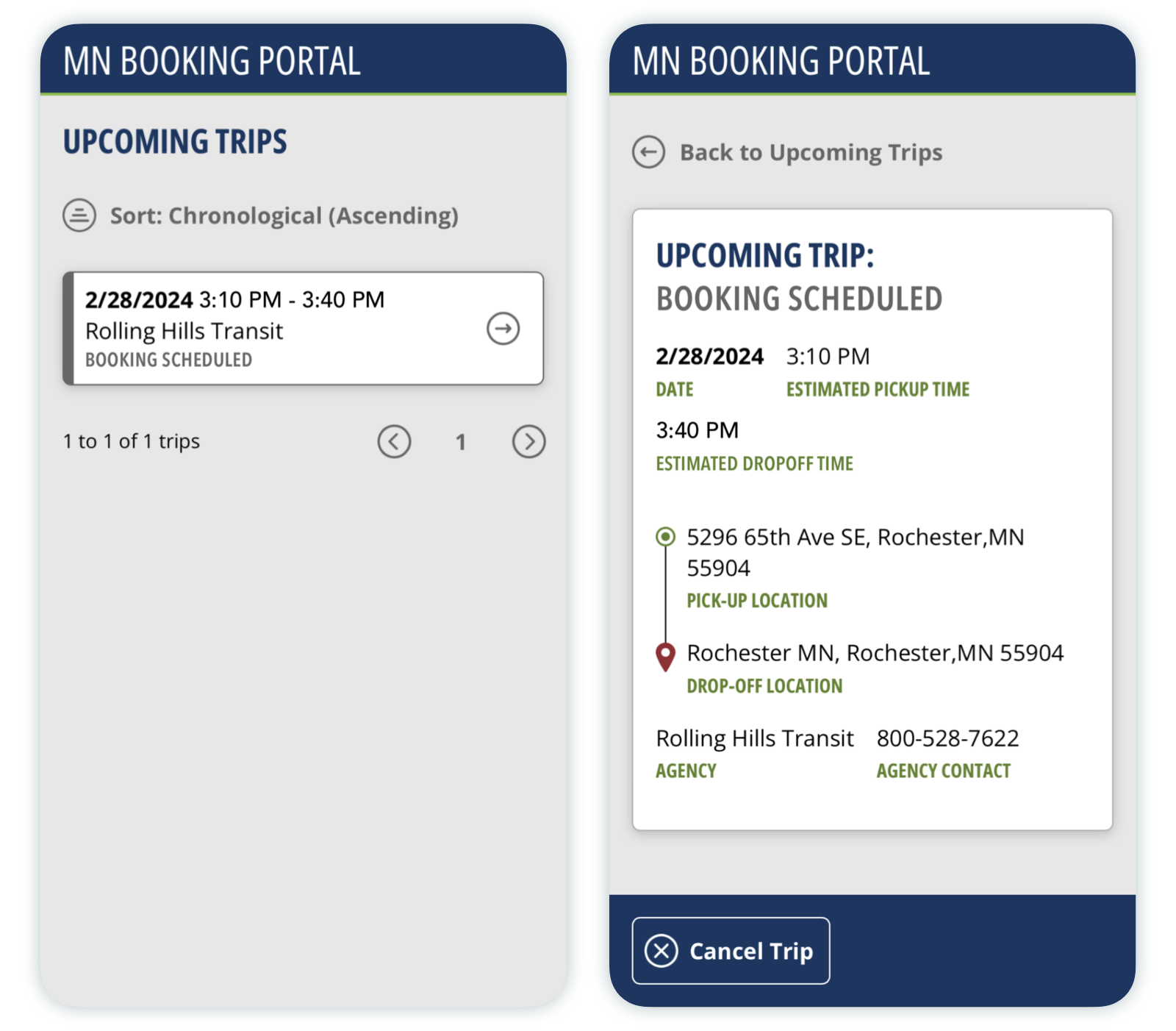 Once your agency has confirmed there is a vehicle and driver that can fulfill your trip request, your trip status will change to "Booking scheduled", and you'll now see a pickup time in the trip's details. Should you need to cancel a ride, just select it from your list of upcoming trips, and tap the "Cancel Trip" button at the bottom left.