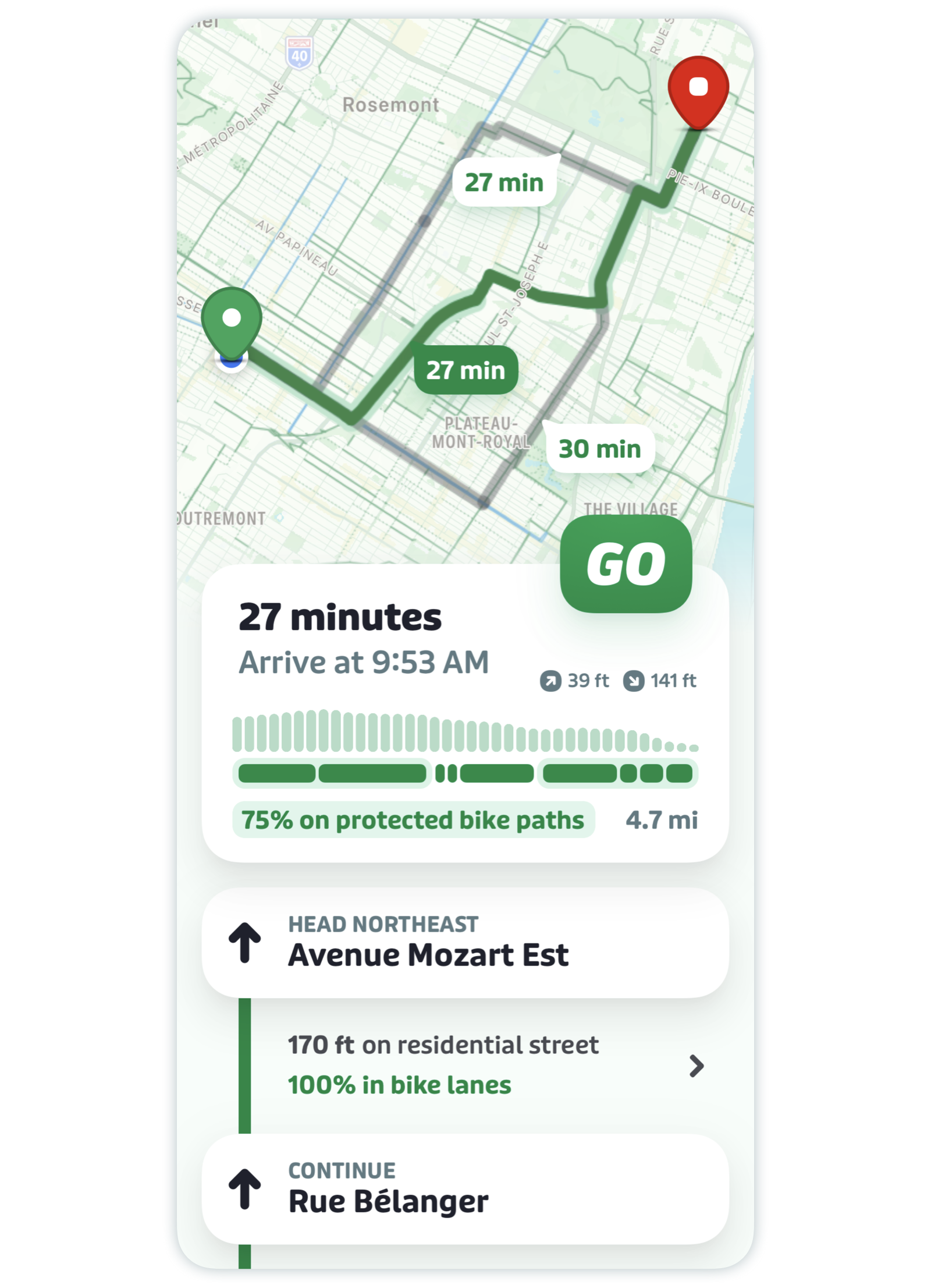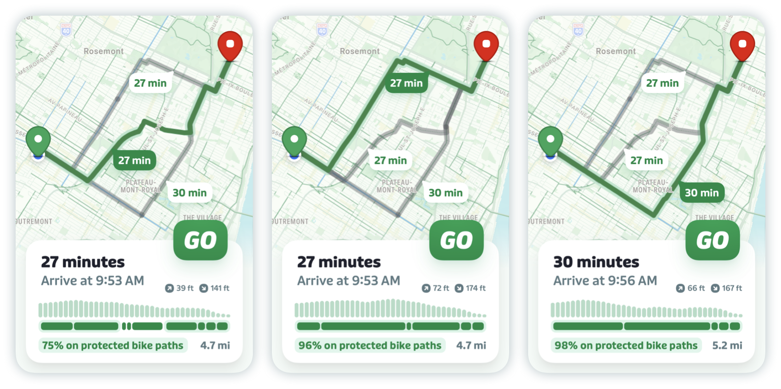 GO bike will also suggest alternative trips (in grey) which you can tap to select. Each trip will vary with respect to estimated arrival time, elevation, and protection level. You can see the differences in the summary section when you select a new trip.