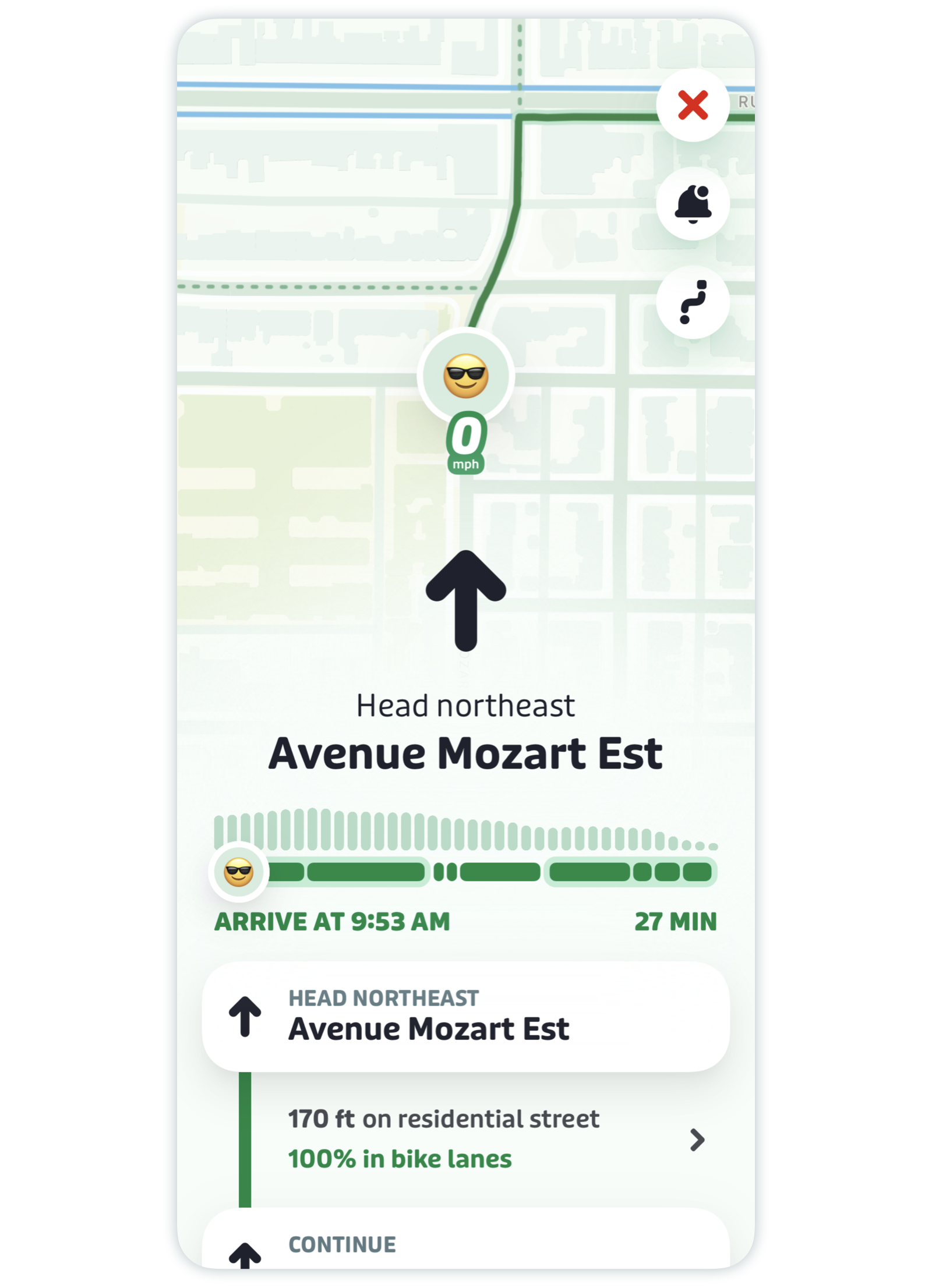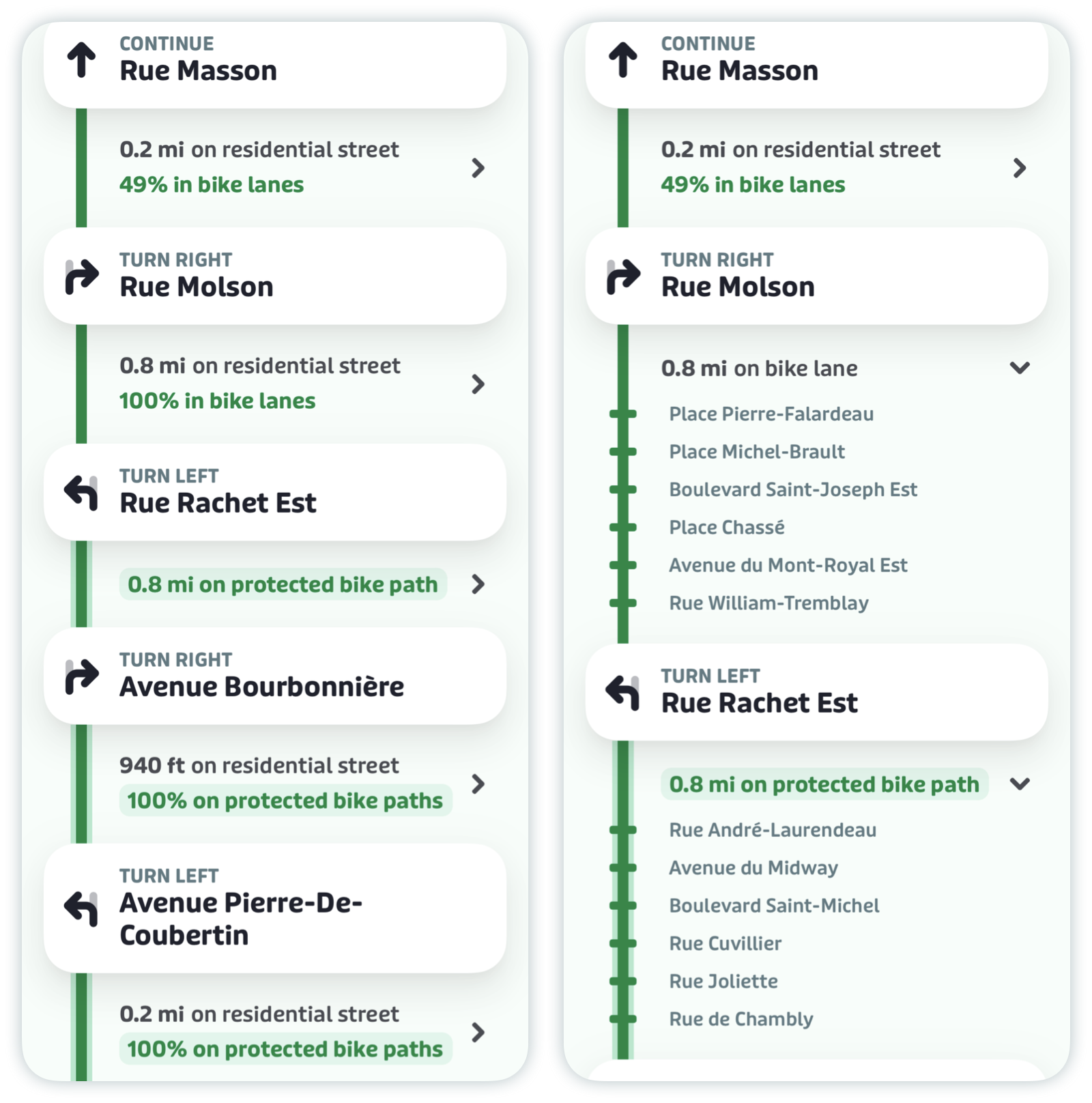 Scroll down to see your entire trip plan, plus each step of the directions, the distance between them and the path type (see below for more details). Tap the chevrons to reveal which cross streets to ride past to get to your next turn.
