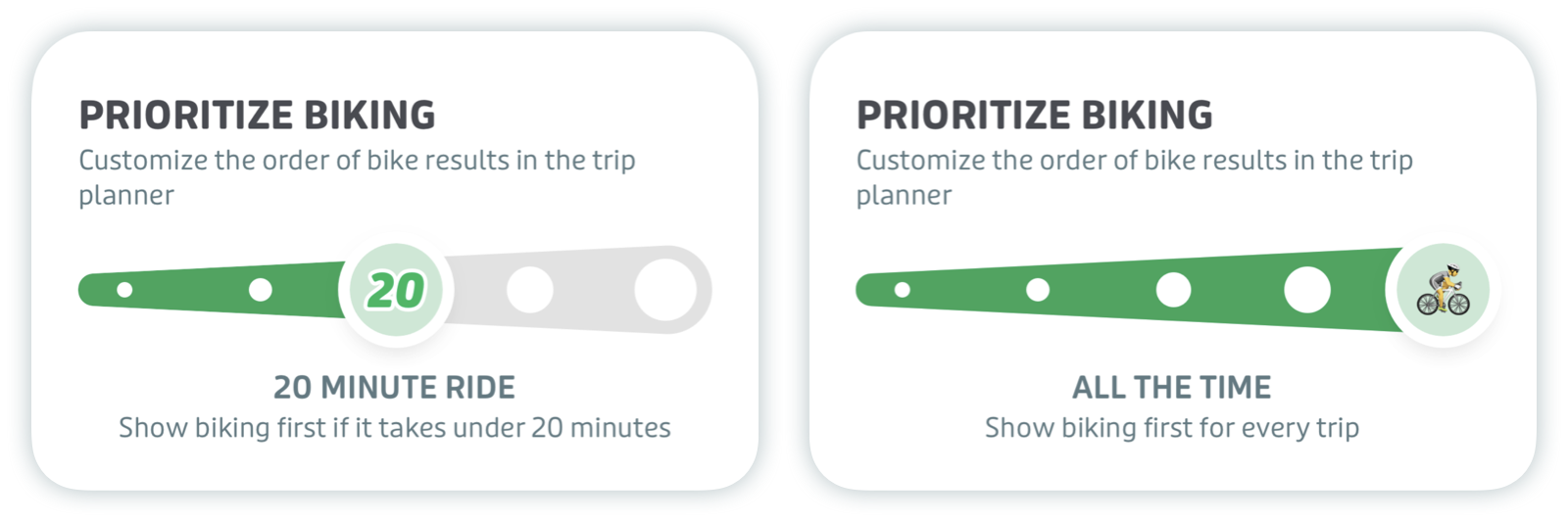 The default priority option shows biking below transit in the trip planner. Adjust the slider to show biking options first for trips under 10, 20, or 30 minutes, or to always show biking options first.
