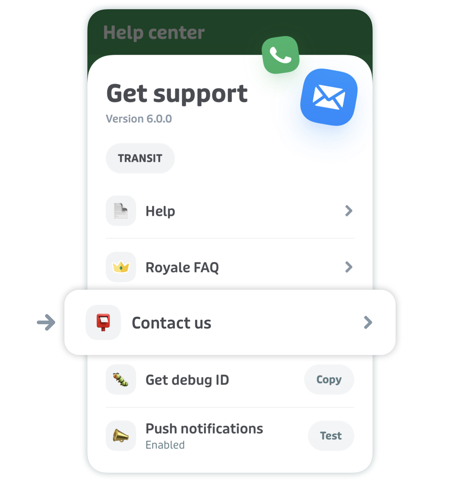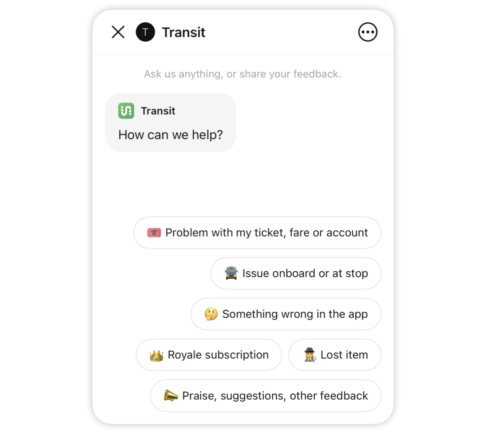 - Tap the relevant option in the decision tree and follow the steps. Depending on the issue, you’ll be prompted to send an email to Transit support or consult a help page for instructions.