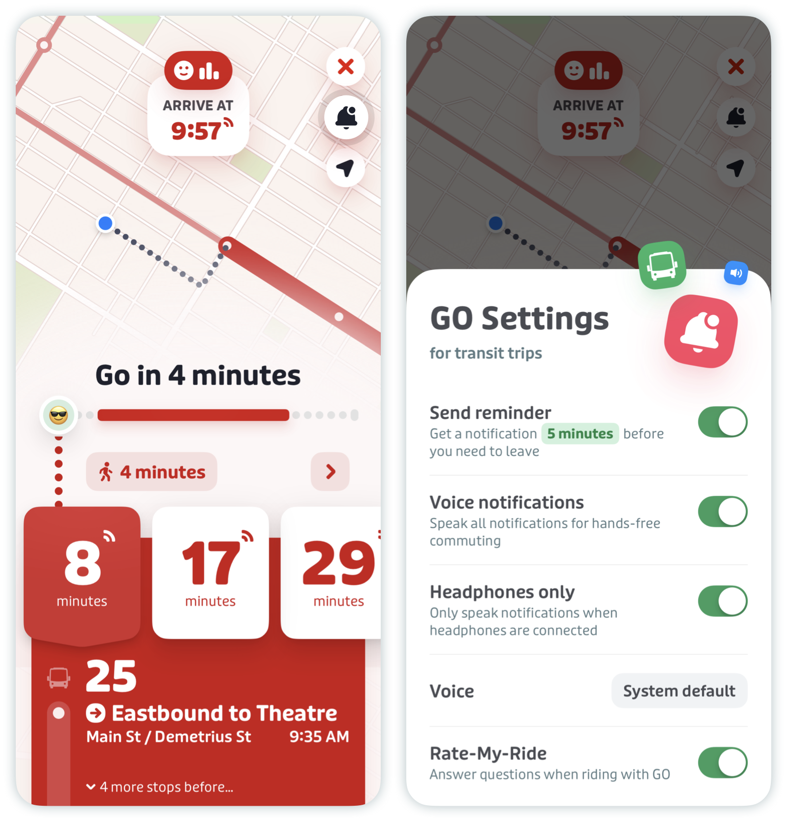 Transit’s GO feature helps you navigate your local transit system by sending notifications to guide you through a trip step-by-step.
