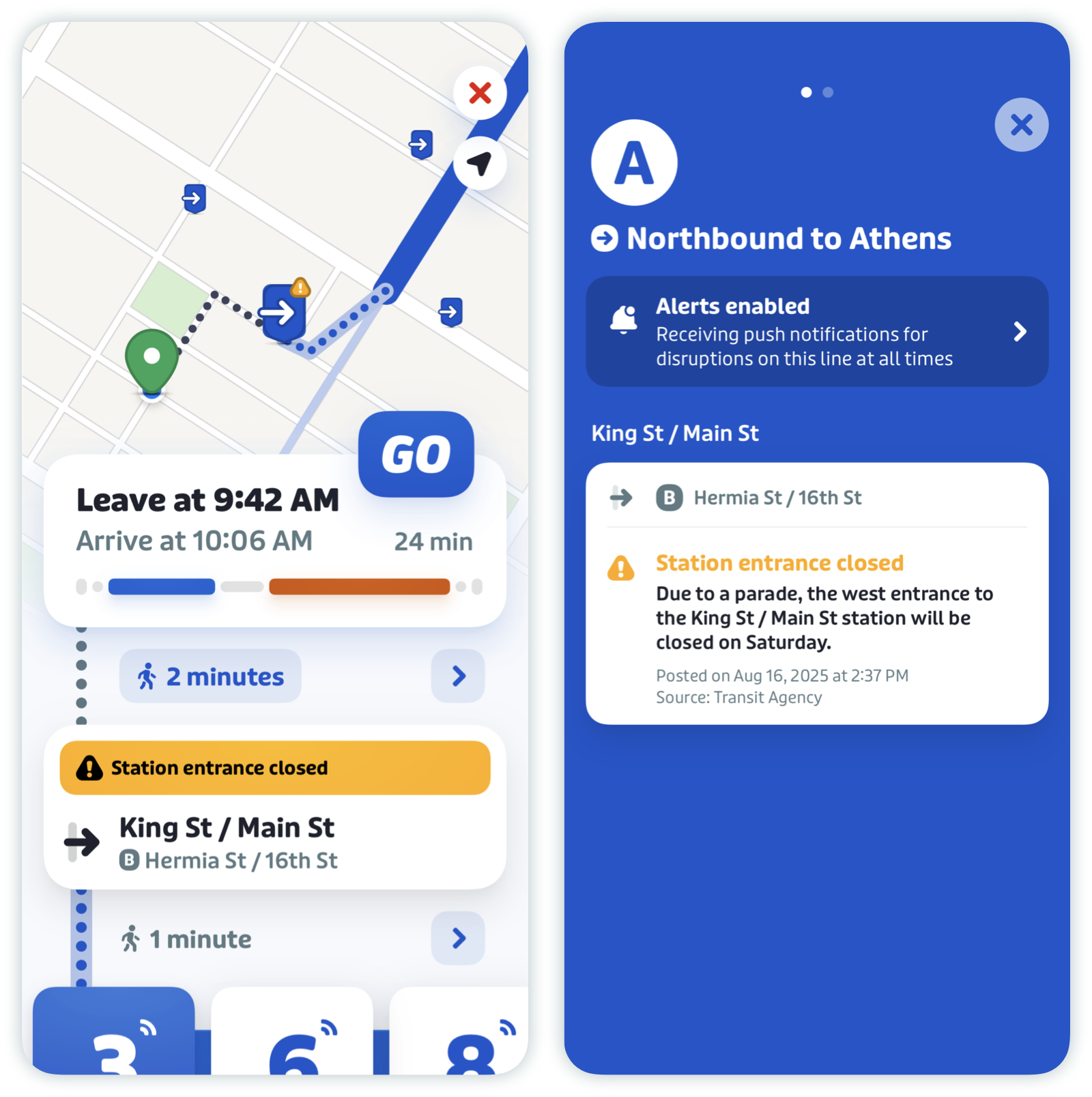 In select cities, you can stay on top of schedule changes, stop relocations, entrance closures, and other unexpected surprises by subscribing to service alerts for your most frequently used transit lines.