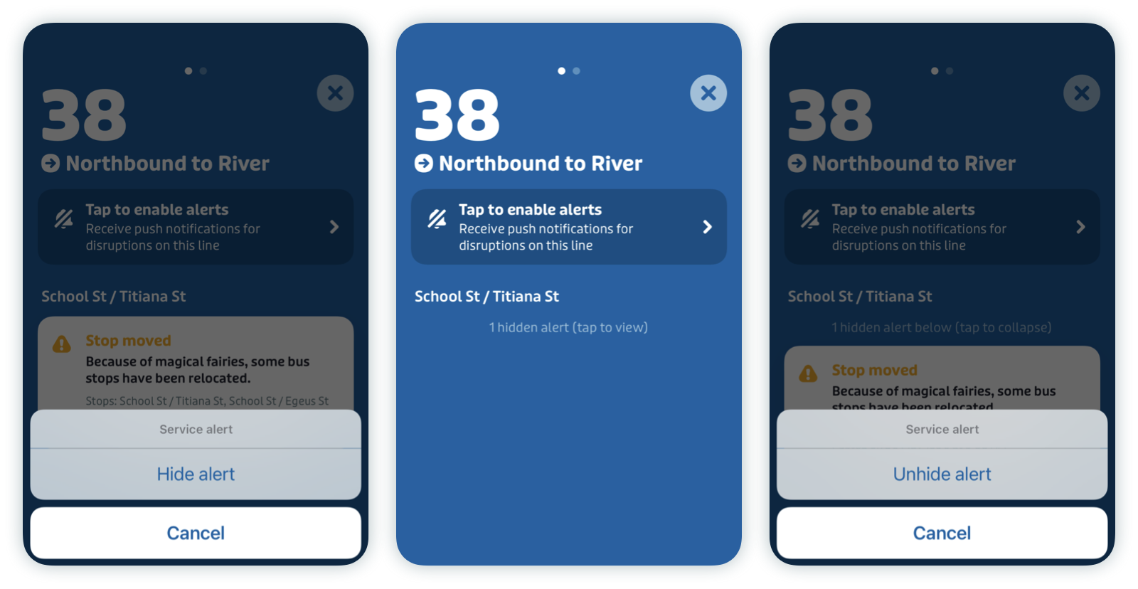 - In the service alerts screen, tap the alert you want to hide then tap "Hide alert" from the popup menu.